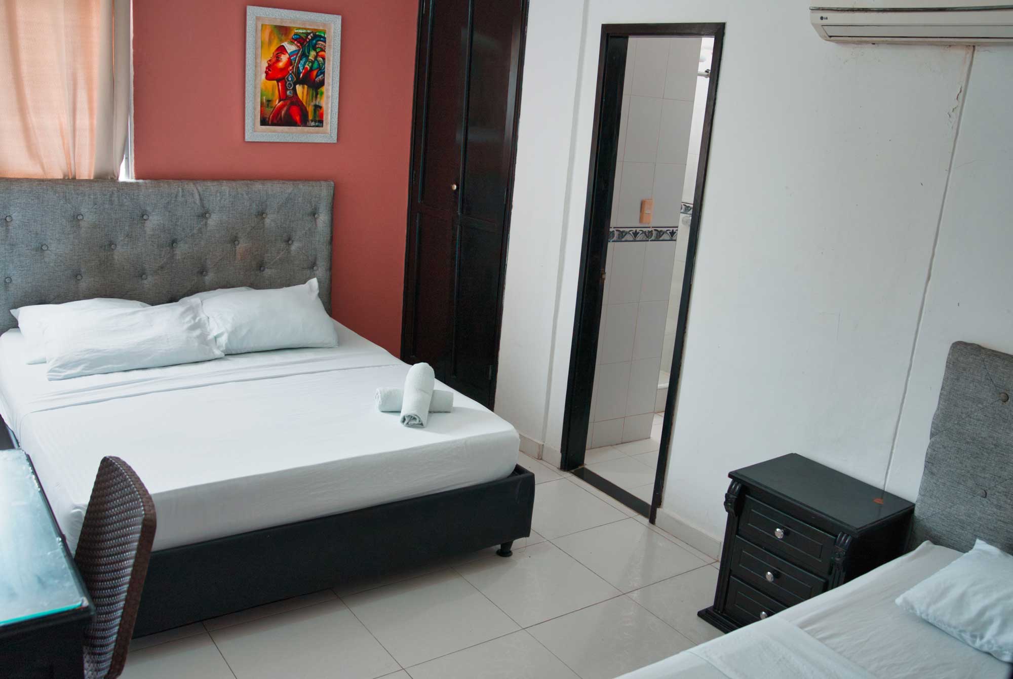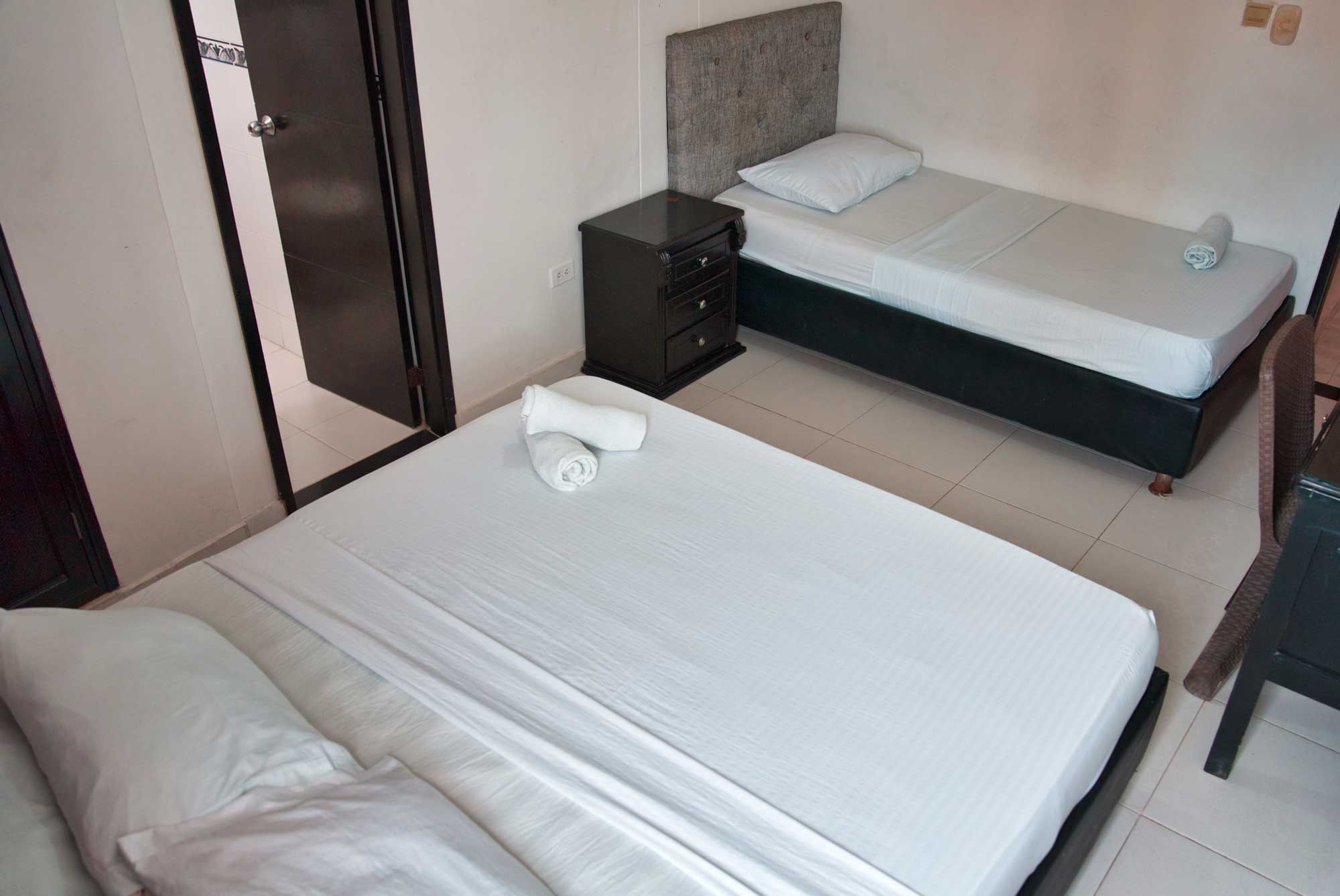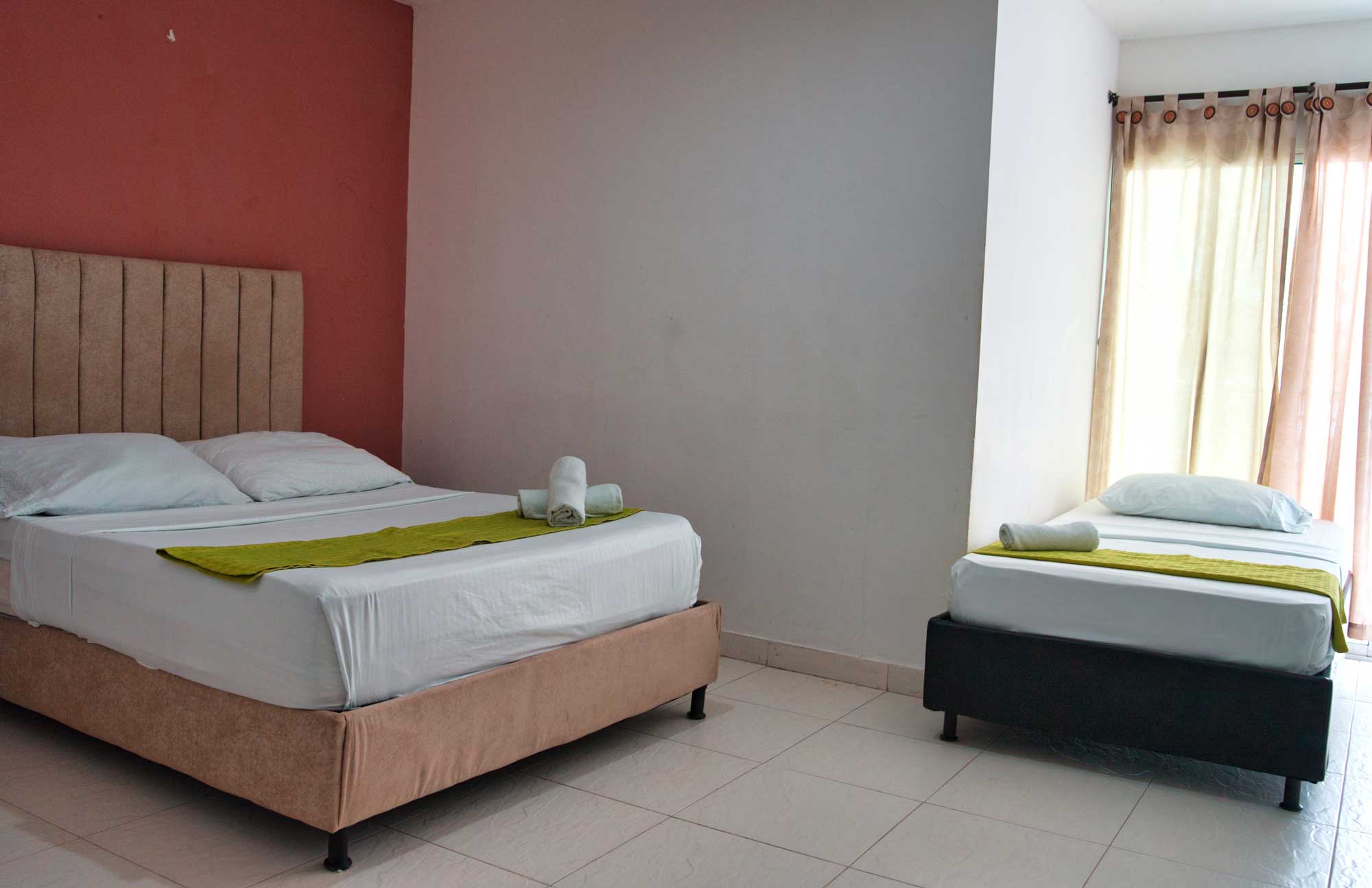 Nuestra habitación triple mixta es ideal para pequeñas familias, grupos de tres personas o parejas que viajan con un acompañante. Está equipada con una cama doble para dos personas y una cama sencilla de un cuerpo, ofreciendo un espacio cómodo, versátil y perfectamente distribuido para garantizar el descanso de todos los huéspedes. La habitación cuenta con aire acondicionado, Wi-Fi gratuito, TV, baño privado y todos los servicios necesarios para una estancia placentera. Su ambiente cálido y funcional la convierte en una excelente opción tanto para viajes cortos como prolongados. Algunas habitaciones pueden ofrecer acceso directo a la piscina o cercanía a las zonas comunes del hotel.